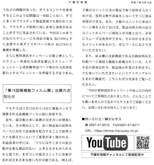 不織布情報に掲載されました 2025年10月10日発刊の『不織布情報 第595号』に弊社が掲載されましたのでお知らせいたします。掲載内容は以下の通りです。 お知らせ 投稿日:2025/11/08 フィルム・ニュース 増刊号に掲載されました お知らせの一覧へ戻る PAGE TOP