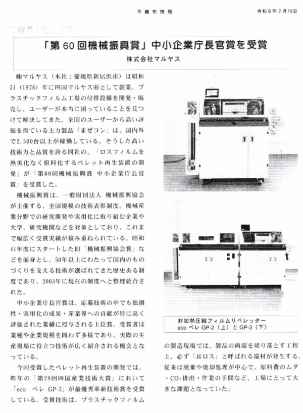 2026年2月10日発刊の『不織布情報 第598号』に弊社が掲載されましたのでお知らせいたします。