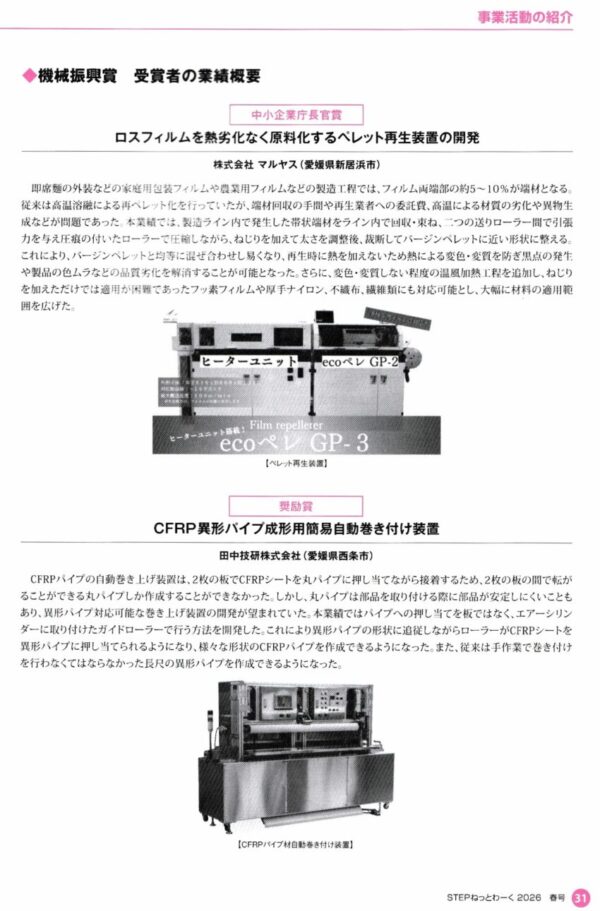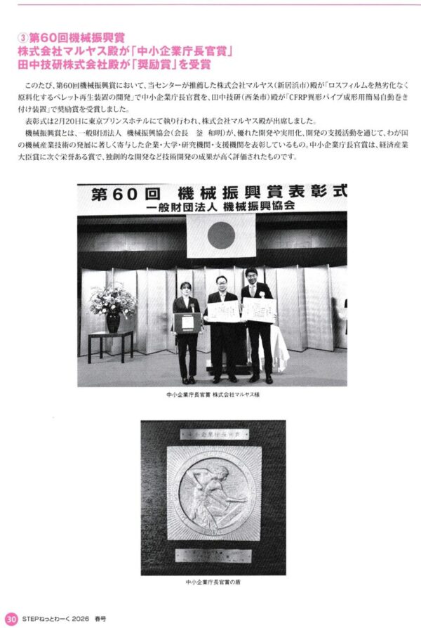 STEPねっとわーくに掲載されました 2026年4月発刊の『STEPねっとわーく2026春号』に弊社が掲載されましたのでお知らせいたします。掲載内容は以下の通りです。 お知らせ 投稿日:2026/04/17 第60回 機械振興賞受賞者業績概要に掲載されました MY TOWNに掲載されました お知らせの一覧へ戻る PAGE TOP